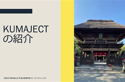 熊本県立大学では、21世紀の地域社会を担う人材育成のため、「地域に学ぶ」「現場に学ぶ」を重視した様々な特色ある教育プロジェクトを展開しています。その1つとして、総合管理学部では、2007年度から人吉・球磨地域の活性化を目的とした学生主体のリサーチ・プロジェクトのとして、KUMAJECT(クマジェクト)を実施しており、2021年度で15回目の実施を迎えます。学部教育の鍵概念である「学際的・総合的アプローチ」により地域づくりを実践的に学ぶ教育プロジェクトであり、人吉・球磨地域の地域づくりの現場に参画しています。