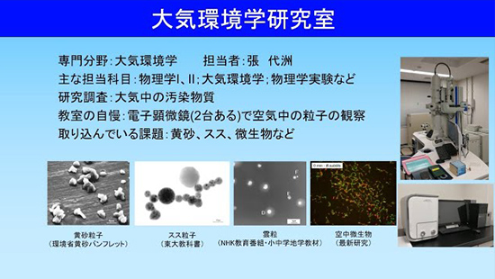 東アジアの大気環境を中心に黄砂やPM2.5といった現象や問題を大気中に浮遊している微粒子や微生物の面から研究しています。浮遊している微粒子を採集し、ミクロレベルまで観察できる電子顕微鏡を用いて、微粒子の形状や成分を観察し、どのような粒子(例えば砂粒や硫酸塩など)が存在しているかを調べます。また、浮遊している微生物を採集し蛍光顕微鏡で生存状態を判断したり、DNAを抽出し解析を行ったりしています。これらの結果と気象条件(気圧や天候など)を組み合わせ、浮遊している微粒子や微生物がどのように飛んで来るのか、どのような影響をうけているのかなどを検討しています。