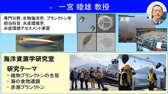 海水を顕微鏡でのぞくと、多種多様で美しい形をしたプランクトン(浮遊生物)を観察することができます。海の生態系はプランクトンから魚類へと食物連鎖が繋がっており、プランクトンは食べられることによって、さまざまな海洋生物の命を支えています。私たちは有明海や八代海といった身近な海から、大型の研究船に乗って外洋である黒潮や親潮域、海氷の発達するオホーツク海にまで出かけて、さまざまなプランクトンの生態を調べています。