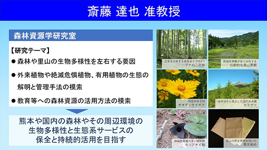 九州中央山地や天草諸島、人吉盆地等、多様な地形・地質からなる熊本県には、実に多くの野生動植物が分布し特有の地域生態系が発達しています。その一方で、近年、自然環境は様々な危機要因に直面し、多くの種の存続が危ぶまれています。本研究室では、熊本県内の森林や里山、湿地、都市緑地などに生育する絶滅危惧植物や外来植物、植生を主な対象とした生態学的研究を行い、それらの保全や管理への貢献することを目指しています。また、地域で受け継がれてきた森林資源利用に関する文化情報を収集し、それにより森林資源の持続的な活用方法を模索しています。